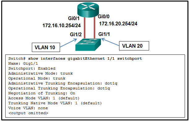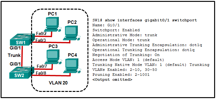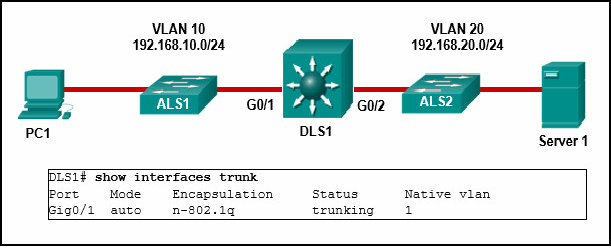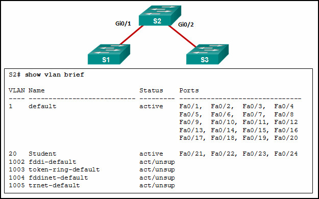 Welcome to your CCNA 2 v7 Modules 1 – 4: Switching Concepts, VLANs, and InterVLAN Routing 1. Which tasks can be accomplished by using the command history feature? (Choose two.) A. View a list of commands entered in a previous session. B. Recall up to 15 command lines by default. C. Set the command history buffer size. D. Recall previously entered commands. E. Save command lines in a log file for future reference. 2. What is the first action in the boot sequence when a switch is powered on? A. load the default Cisco IOS software B. load boot loader software C. low-level CPU initialization D. load a power-on self-test program None 3. What must an administrator have in order to reset a lost password on a router? A. a TFTP server B. a crossover cable C. access to another router D. physical access to the router None 4. When configuring a switch for SSH access, what other command that is associated with the login local command is required to be entered on the switch? A. enable secret password B. password password C. username username secret secret D. login block-for seconds attempts number within*seconds* None 5. Which command displays information about the auto-MDIX setting for a specific interface? A. show interfaces B. show controllers C. show processes D. show running-config None 6. If one end of an Ethernet connection is configured for full duplex and the other end of the connection is configured for half duplex, where would late collisions be observed? A. on both ends of the connection B. on the full-duplex end of the connection C. only on serial interfaces D. on the half-duplex end of the connection None 7. Which command is used to set the BOOT environment variable that defines where to find the IOS image file on a switch? A. config-register B. boot system C. boot loader D. confreg None 8. What does a switch use to locate and load the IOS image? A. BOOT environment variable B. IOS image file C. POST D. startup-config E. NVRAM None 9. Which protocol adds security to remote connections? A. FTP B. HTTP C. NetBEUI D. POP E. SSH None 10. What is a characteristic of an IPv4 loopback interface on a Cisco IOS router? A. The no shutdown command is required to place this interface in an UP state. B. It is a logical interface internal to the router. C. Only one loopback interface can be enabled on a router. D. It is assigned to a physical port and can be connected to other devices. None 11. What is the minimum Ethernet frame size that will not be discarded by the receiver as a runt frame? A. 64 bytes B. 512 bytes C. 1024 bytes D. 1500 bytes None 12. After which step of the switch bootup sequence is the boot loader executed? A. after CPU initialization B. after IOS localization C. after flash file system initialization D. after POST execution None 13. Which impact does adding a Layer 2 switch have on a network? A. an increase in the number of dropped frames B. an increase in the size of the broadcast domain C. an increase in the number of network collisions D. an increase in the size of the collision domain None 14. Which characteristic describes cut-through switching? A. Error-free fragments are forwarded, so switching occurs with lower latency. B. Frames are forwarded without any error checking. C. Only outgoing frames are checked for errors. D. Buffering is used to support different Ethernet speeds. None 15. What is the significant difference between a hub and a Layer 2 LAN switch? A. A hub extends a collision domain, and a switch divides collision domains. B. A hub divides collision domains, and a switch divides broadcast domains. C. Each port of a hub is a collision domain, and each port of a switch is a broadcast domain. D. A hub forwards frames, and a switch forwards only packets. None 16. Which statement is correct about Ethernet switch frame forwarding decisions? A. Frame forwarding decisions are based on MAC address and port mappings in the CAM table. B. Cut-through frame forwarding ensures that invalid frames are always dropped. C. Only frames with a broadcast destination address are forwarded out all active switch ports. D. Unicast frames are always forwarded regardless of the destination MAC address. None 17. How do switch buffers affect network performance? A. They provide error checking on the data received. B. They store frames received, thus preventing premature frame discarding when network congestion occurs. C. They provide extra memory for a particular port if autonegotiation of speed or duplex fails. D. They hold data temporarily when a collision occurs until normal data transmission resumes. None 18. Which switch characteristic helps keep traffic local and alleviates network congestion? A. high port density B. fast port speed C. large frame buffers D. fast internal switching None 19. Which switch component reduces the amount of packet handling time inside the switch? A. ASIC B. dual processors C. large buffer size D. store-and-forward RAM None 20. What information is added to the switch table from incoming frames? A. source MAC address and incoming port number B. destination MAC address and incoming port number C. source IP address and incoming port number D. destination IP address and incoming port number None 21. Which switching method ensures that the incoming frame is error-free before forwarding? A. cut-through B. FCS C. fragment free D. store-and-forward None 22. Refer to the exhibit. How many broadcast domains are displayed? A. 1 B. 4 C. 8 D. 16 E. 55 None 23. Under which two occasions should an administrator disable DTP while managing a local area network? (Choose two.) A. when connecting a Cisco switch to a non-Cisco switch B. when a neighbor switch uses a DTP mode of dynamic auto C. when a neighbor switch uses a DTP mode of dynamic desirable D. on links that should not be trunking E. on links that should dynamically attempt trunking 24. Which two characteristics describe the native VLAN? (Choose two.) A. Designed to carry traffic that is generated by users, this ty