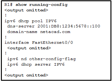 Welcome to your CCNA 2 v7 Modules 7 – 9: Available and Reliable Networks 1. A DHCP-enabled client PC has just booted. During which two steps will the client PC use broadcast messages when communicating with a DHCP server? (Choose two.) A. DHCPDISCOVER B. DHCPACK C. DHCPOFFER D. DHCPREQUEST E. DHCPNAK 2. What is the administrator trying to achieve? An administrator issues the commands: Router(config)# interface g0/1 Router(config-if)# ip address dhcp A. configuring the router to act as a DHCPv4 server B. configuring the router to obtain IP parameters from a DHCPv4 server C. configuring the router to act as a relay agent D. configuring the router to resolve IP address conflicts None 3. When a client is requesting an initial address lease from a DHCP server, why is the DHCPREQUEST message sent as a broadcast? A. The client does not yet know the IP address of the DHCP server that sent the offer. B. The DHCP server may be on a different subnet, so the request must be sent as a broadcast. C. The client does not have a MAC address assigned yet, so it cannot send a unicast message at Layer 2. D. The client may have received offers from multiple servers, and the broadcast serves to implicitly decline those other offers. None 4. Which DHCP IPv4 message contains the following information? Destination address: 255.255.255.255Client IPv4 address: 0.0.0.0Default gateway address: 0.0.0.0Subnet mask: 0.0.0.0 A. DHCPACK B. DHCPDISCOVER C. DHCPOFFER D. DHCPREQUEST None 5. Which protocol automates assignment of IP addresses on a network, and which port number does it use? (Choose two.) A. DHCP B. DNS C. SMB D. 53 E. 67 F. 80 6. Refer to the exhibit. PC1 is configured to obtain a dynamic IP address from the DHCP server. PC1 has been shut down for two weeks. When PC1 boots and tries to request an available IP address, which destination IP address will PC1 place in the IP header? A. 192.168.1.1 B. 192.168.1.255 C. 255.255.255.255 D. 192.168.1.8 None 7. Which message does an IPv4 host use to reply when it receives a DHCPOFFER message from a DHCP server? A. DHCPOFFER B. DHCPDISCOVER C. DHCPREQUEST D. DHCPACK None 8. Which command, when issued in the interface configuration mode of a router, enables the interface to acquire an IPv4 address automatically from an ISP, when that link to the ISP is enabled? A. service dhcp B. ip address dhcp C. ip helper-address D. ip dhcp pool None 9. Which kind of message is sent by a DHCP client when its IP address lease has expired? A. a DHCPDISCOVER unicast message B. a DHCPREQUEST broadcast message C. a DHCPREQUEST unicast message D. a DHCPDISCOVER broadcast message None 10. A host PC is attempting to lease an address through DHCP. What message is sent by the server to let the client know it is able to use the provided IP information? A. DHCPDISCOVER B. DHCPOFFER C. DHCPREQUEST D. DHCPACK E. DHCPNACK None 11. What is one indication that a Windows computer did not receive an IPv4 address from a DHCP server? A. The computer cannot ping 127.0.0.1. B. The computer receives an IP address that starts with 169.254. C. Windows displays a DHCP timeout message. D. The computer cannot ping other devices on the same network with IP addresses in the 169.254.0.0/16 range. None 12. Which DHCPv4 message will a client send to accept an IPv4 address that is offered by a DHCP server? A. broadcast DHCPACK B. broadcast DHCPREQUEST C. unicast DHCPACK D. unicast DHCPREQUEST None 13. A small coffee shop is offering free Wi-Fi to customers. The network includes a wireless router and a DSL modem that is connected to the local phone company. What method is typically used to configure the connection to the phone company? A. Set the WAN connection in the wireless router as a DHCP client. B. Set the connection between the wireless router and the DSL modem as a private IP network. C. Set the DSL modem as a DHCP client to get a public IP address from the wireless router. D. Set the DSL modem as a DHCP client to the phone company and a DHCP server for the internal connection. None 14. A company uses DHCP to manage IP address deployment for employee workstations. The IT department deploys multiple DHCP servers in the data center and uses DHCP relay agents to facilitate the DHCP requests from workstations. Which two UDP ports are used to forward DHCP traffic? (Choose two.) A. 23 B. 53 C. 67 D. 68 E. 80 15. A client device on an Ethernet segment needs an IP address in order to communicate on the network. A DHCP server with IP address 192.168.1.1 has been configured and enabled on the network. How will a client device obtain a usable IP address for this network? A. Send a DHCPACK packet to the default gateway address. B. Use a statically configured IP address from the pool of IP addresses that is offered by the DHCP server. C. Send a DHCPDISCOVER message to physical address FF-FF-FF-FF-FF-FF. D. Send a DHCPREQUEST packet to IP address 255.255.255.255. None 16. What is an advantage of configuring a Cisco router as a relay agent? A. It can provide relay services for multiple UDP services. B. It reduces the response time from a DHCP server. C. It can forward both broadcast and multicast messages on behalf of clients. D. It will allow DHCPDISCOVER messages to pass without alteration. None 17. Which statement is true about DHCP operation? A. When a device that is configured to use DHCP boots, the client broadcasts a DHCPDISCOVER message to identify any available DHCP servers on the network. B. A client must wait for lease expiration before it sends another DHCPREQUEST message. C. If the client receives several DHCPOFFER messages from different servers, it sends a unicast DHCPREQUEST message to the server from which it chooses to obtain the IP information D. The DHCPDISCOVER message contains the IP address and subnet mask to be assigned, the IP address of the DNS server, and the IP address of the default gateway. None 18. A network administrator configures a router to send RA messages with M flag as 0 and O flag as 1