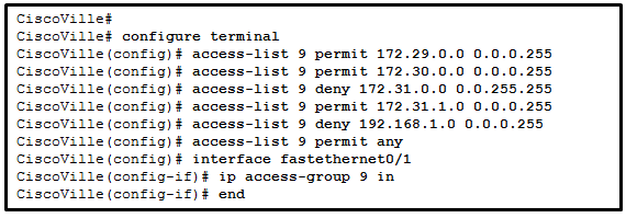 Refer to the exhibit. A network administrator has configured ACL 9 as shown. Users on the 172.31.1.0 /24 network cannot forward traffic through router CiscoVille. What is the most likely cause of the traffic failure?
