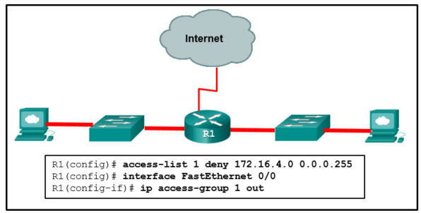 Refer to the exhibit. Internet privileges for an employee have been revoked because of abuse but the employee still needs access to company resources. What is the best ACL type and placement to use in this situation?