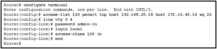A network administrator needs to configure a standard ACL so that only the workstation of the administrator with the IP address 192.168.15.23 can access the virtual terminal of the main router. Which two configuration commands can achieve the task? (Choose two.)