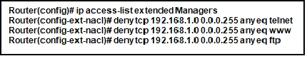Refer to the exhibit. The named ACL “Managers” already exists on the router. What will happen when the network administrator issues the commands that are shown in the exhibit?