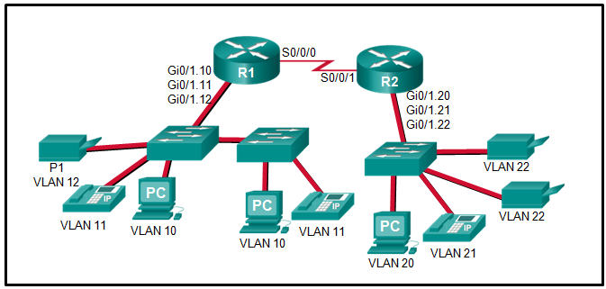 Refer to the exhibit. The Gigabit interfaces on both routers have been configured with subinterface numbers that match the VLAN numbers connected to them. PCs on VLAN 10 should be able to print to the P1 printer on VLAN 12. PCs on VLAN 20 should print to the printers on VLAN 22. What interface and in what direction should you place a standard ACL that allows printing to P1 from data VLAN 10, but stops the PCs on VLAN 20 from using the P1 printer? (Choose two.)