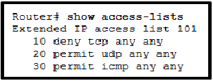 Router(config-ext-nacl)# 20 deny udp any any