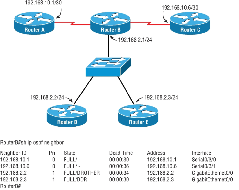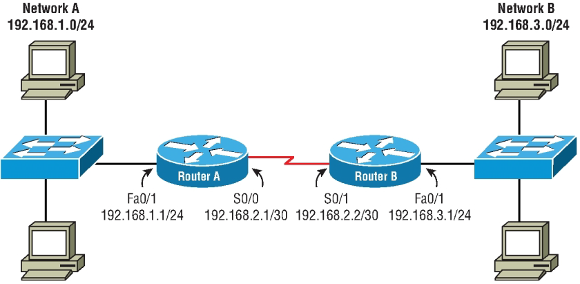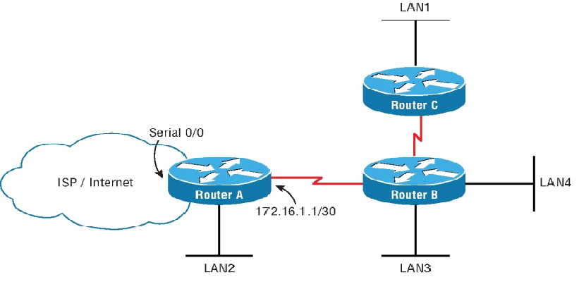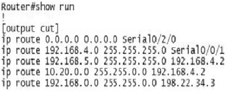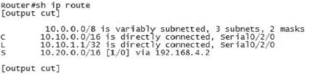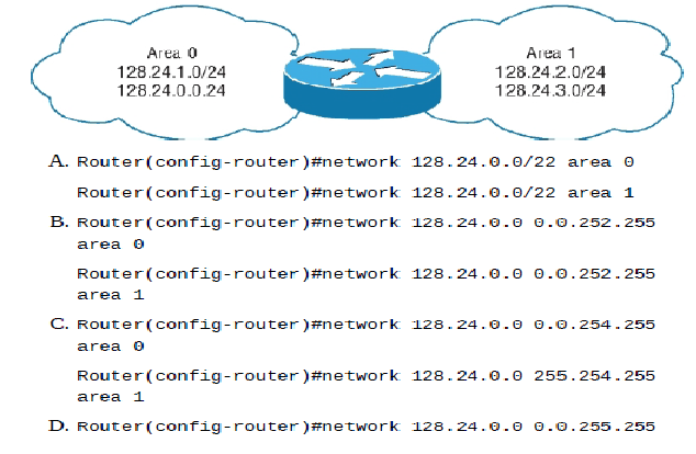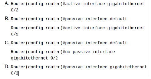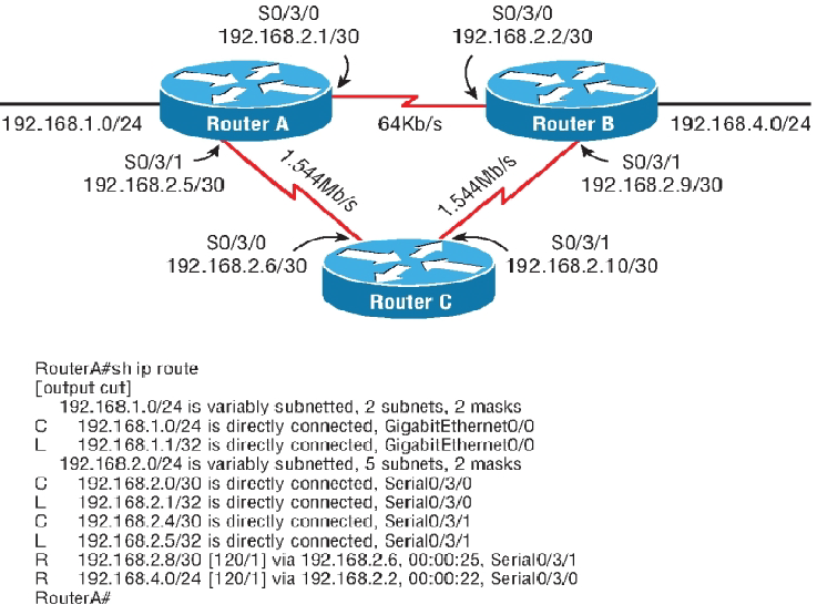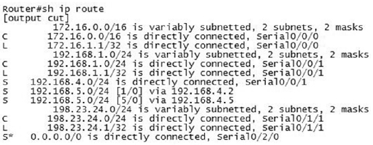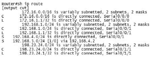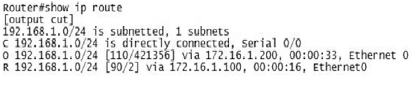 Welcome to your CCNA-IP Connectivity 1. 1. Which is a reason for using a dynamic routing protocol? A. You have a network with only a few routers and subnets per branch. B. You have a network with only a few VLANs and one router. C. You have a network with a large number of VLANs and only one router. D. You have a network with a few subnets and many routers. None 2. 2. How are routers managed with interior gateway protocols? A. Routers are grouped into autonomous systems. B. Routing protocols are redistributed between ASs. C. All routers use the same interior routing protocol. D. All network IDs are advertised with the same autonomous system number. None 3. 3. What is the maximum hop count for RIP? A. 15 hops B. 100 hops C. 255 hops D. 16 hops None 4. 4. Which statement is true about RIPv2 advertisements? A. RIPv2 allows for neighborship through hello packets. B. RIPv2 broadcasts only updates on all active interfaces. C. RIPv2 multicasts the full routing table every 30 seconds. D. RIPv2 multicasts the full routing table every 60 seconds. None 5. 5. Which multicast address does RIPv2 use for advertising routes? A. 224.0.0.5 B. 224.0.0.9 C. 224.0.0.6 D. 224.0.0.2 None 6. 6. In the following exhibit, a packet from network 192.168.1.0/24 is destined for 192.168.4.0/24. The route the packet will take will be Router A to Router B, determined by RIPv2. However, the bandwidth is only 64 Kb/s. How can you force packets to travel over the 1.544 Mb/s links? A. RouterA(config-router)#passive interface serial 0/3/0 RouterB(config-router)#passive interface serial 0/3/0 B. RouterA(config)#ip route 192.168.4.0 255.255.255.0 serial 0/3/1 RouterB(config)#ip route 192.168.1.0 255.255.255.0 serial 0/3/1 C. RouterA(config-router)#cost 2 serial 0/3/0 RouterB(config-router)#cost 2 serial 0/3/0 D. RouterA(config-if)#metric 2 serial 0/3/0 RouterB(config-if)#metric 2 serial 0/3/0 A. Option A B. Option B C. Option C D. Option D None 7. 7. Which routing protocol will not contain a topology of the network? A. EIGRP B. RIP C. OSPF D. BGP None 8. 8. Which routing loop avoidance method is used by routers to prevent routing updates from exiting an interface in which they have been learned? A. Routing to infinity B. Route poisoning C. Holddowns D. Split horizon None 9. 9. You are examining a routing table and see a route marked with S*. Which type of route is this? A. Static route B. Default route C. Dynamic route D. OSPF route None 10. 10. You are examining a routing table and see the entry in the following exhibit. What does the 4 in the underlined number represent? A. The 4 represents the administrative distance. B. The 4 represents the protocol. C. The 4 represents the metric. D. The 4 represents the position in the routing table. None 11. 11. Which command will allow you to verify routes line by line in a subset of the general route statement? A. Router#show ip route 160.45.23.0 255.255.255.0 longerprefixes B. Router#show ip route 160.45.23.0 255.255.255.0 C. Router#show ip route bgp D. Router#show ip route None 12. 12. Examining the show ip route statement in the exhibit, which will be the next hop for a destination address of 192.168.1.5? A. The gateway 172.16.1.200 B. The exit interface Serial 0/0 C. The gateway 172.16.1.100 D. The exit interface Ethernet0 None 13. 13. Which route statement is configured when an IP address of 203.80.53.22/19 is configured on an interface? A. S 203.80.16.0/19 is directly connected, Serial 0/0/0 B. S 203.80.32.0/19 is directly connected, Serial 0/0/0 C. S 203.80.48.0/19 is directly connected, Serial 0/0/0 D. S 203.80.53.22/19 is directly connected, Serial 0/0/0 None 14. 14. In the following exhibit, what does the top line of the output represent? A. The 10.0.0.0/8 is a route in the routing table. B. The 10.0.0.0/8 is a summarization of the routes in the table. C. The 10.0.0.0/8 is the router’s network address. D. The 10.0.0.0/8 has been populated from another router. None 15. 15. You are examining a routing table and see the entry in the following exhibit. What does the underlined number represent? A. The number represents the current time. B. The number represents the delay in microseconds of the connection. C. The number represents the time the route has been in the routing table. D. The number represents the time the interface has been up. None 16. 16. In the following exhibit is a copy of the running-config. What is the next hop for a destination address of 192.168.4.85? A. Interface Serial 0/2/0 B. IP address 192.168.4.2 C. Interface Serial 0/0/1 D. IP address 198.22.34.3 None 17. 17. Using the following exhibit, if traffic enters Router A for a destination address of 198.44.4.7, what must be configured to allow routing to the host? A. RouterA(config)#ip route 198.44.4.0 255.255.255.0 198.44.4.5 B. RouterA(config)#ip route 198.44.4.0 255.255.255.0 fast 0/1 C. RouterA(config)#ip route 198.44.4.0/24 fast 0/1 D. Nothing needs to be done. None 18. 18. You need to create a route for 205.34.54.85/29 with the next hop being 205.34.55.2. Which command would create this route? A. Router(config)#ip route 205.34.54.85/24 205.34.55.2 B. Router(config)#ip route 205.34.54.85 255.255.255.248 205.34.55.2 C. Router(config)#ip route 205.34.54.85 255.255.255.240 205.34.55.2 D. Router(config)#ip route 205.34.55.2 255.255.255.248 205.34.54.85 None 19. 19. When a static route is made, what is the default AD? A. AD of 1 B. AD of 0 C. AD of 2 D. AD of 255 None 20. 20. What is the AD of RIP? A. AD of 90 B. AD of 100 C. AD of 110 D. AD of 120 None 21. 21. Why are ADs used with routing tables? A. ADs define protocol standards. B. ADs define reliability of routing protocols. C. ADs allow for the shortest distance between routes. D. ADs are programmed by the administrator for path selection. None 22. 22. What is the AD of a directly connected network? A. The AD is 0. B. The AD is 1. C. The AD is 5. D. Directly connected networks do not have an AD. None 23. 23. What is the AD of internal EIGRP? A. 90 B. 1
