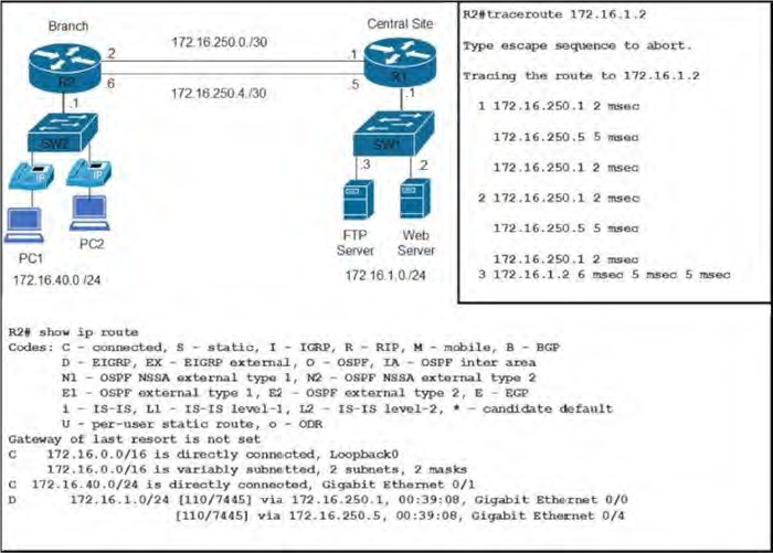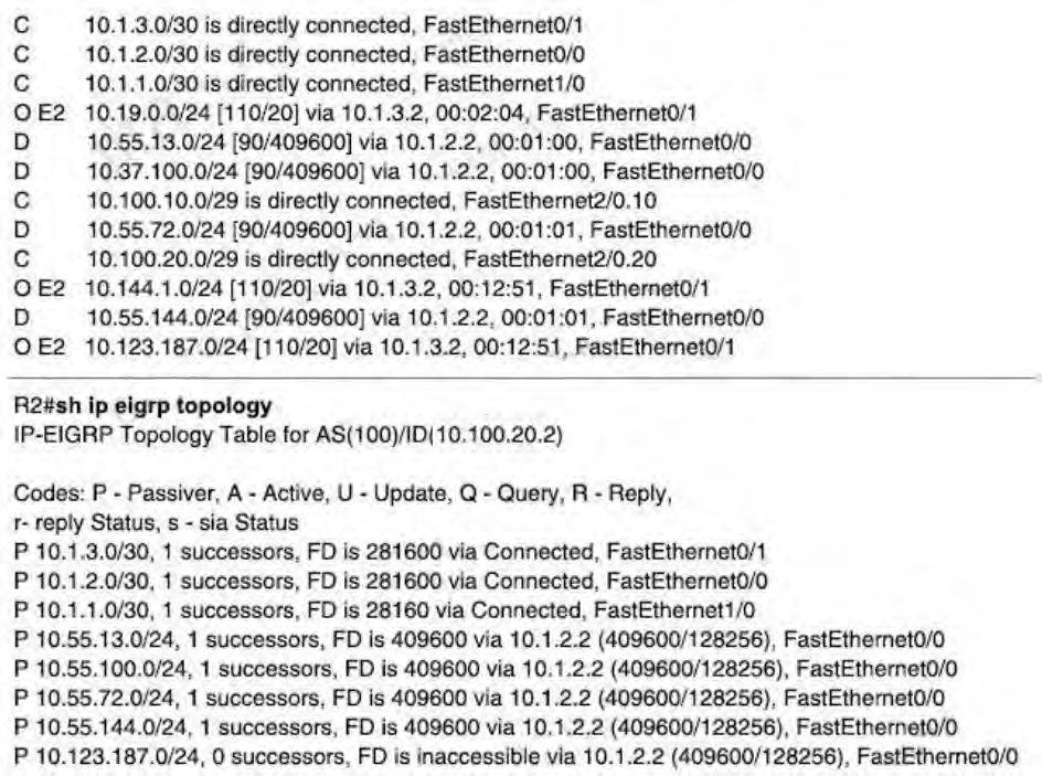 Welcome to your ENCORE-INFRASTRUCTURE-LAYER3 1. Which type of routing protocol uses LSAs and TLVs to support extended features? A. path vector B. link-state C. hybrid D. distance vector None 2. What are two characteristics of link-state routing protocols? (Choose two.) A. They can load balance across unequal metric cost paths. B. They use path attributes to determine the best loop-free path. C. They periodically send full routing table updates to directly connected neighbors. D. They provide routers with a synchronized identical map of the network. E. They use more CPU and memory resources than distance vector protocols do. 3. What data is used by OSPF and ISIS for loop prevention? A. hop count to the destination B. feasible distance calculation to the destination C. autonomous system path to the destination D. a synchronized map of the network None 4. Which routing protocol incorporates characteristics of both distance vector and link-state protocols? A. iBGP B. EBGP C. SIS D. EIGRP None 5. How do EIGRP routers establish and maintain neighbor relationships? A. by exchanging routing tables with directly attached routers B. by exchanging neighbor tables with directly attached routers C. by comparing known routes to information received in updates D. by dynamically learning new routes from neighbors E. by exchanging hello packets with neighboring routers None 6. A router has installed several routes into the routing table. How will the router determine which route to use to forward packets? A. the lowest administrative distance B. the highest metric C. the lowest metric D. the longest prefix match None 7. What is the effect of configuring the ipv6 unicast-routing command on a router? A. to assign the router to the all-nodes multicast group B. to permit only unicast packets on the router C. to enable the router as an IPv6 router D. to prevent the router from joining the all-routers multicast group None 8. Why would a floating static route be configured with an administrative distance that is higher than the administrative distance of a dynamic routing protocol that is running on the same router? A. to load-balance the traffic B. to act as a gateway of last resort C. to be used as a backup route D. to be the priority route in the routing table None 9. Which static route statement shows a recursive IPv6 static route? A. ipv6 route 2001:db8:cafe:1::/56 S0/0/0 B. ipv6 route 0::/0 S0/0/0 C. ipv6 route 0::/0 S0/0/0 254 D. ipv6 route 2001:db8:cafe:1::/56 S0/0/0 2001:db8:1000:10::1 E. ipv6 route 2001:db8:cafe:1::/56 2001:db8:1000:10::1 None 10. What is used by BGP to guarantee a loop free path to reach a destination? A. the count of router hops to reach a destination B. the cumulative cost as measured in bandwidth C. a record of each autonomous system that a routing advertisement has traversed D.a distance calculation based on cumulative delay and minimum bandwidth None 11. Refer to a portion of an EIGRP topology table. What is the reported distance of the successor route for 172.18.3.0/24? P 172.18.3.0/24, 1 successors, __ is 2172416 via 172.18.4.3 (2172416/28160), Serial0/0/1 P 172.18.5.0/24, 1 successors, __ is 2495120 via 172.18.6.3 (2495120/227692), Serial0/1/0 P 192.168.24.0/24, 1 successors, __ is 2684416 via 192.168.13.5 (2684416/2072316), Serial0/0/0 via 172.18.4.3 (2854912/2342912), Serial0/0/1 P 10.34.1.0/24, 1 successors, __ is 3072 via 10.13.1.3 (3072/2937), GigabitEthernet0/1 via 10.14.1.4 (5376/2937), GigabitEthernet0/2 A. 2684416 B. 2172416 D. 28160 None 12. What is the administrative distance of a directly connected interface A. 20 B. 5 C. 0 D. 1 None 13. Which protocol number is used to indicate that an EIGRP packet is encapsulated in an IP packet? A. 6 B. 17 C. 88 D. 89 None 14. Which statement describes the autonomous system number used in EIGRP configuration on a Cisco router? A. It carries the geographical information of the organization. B. It is a globally unique autonomous system number that is assigned by IANA. C. It functions as a process ID in the operation of the router. D. It identifies the ISP that provides the connection to network of the organization. None 15. Which bandwidth value is used when calculating the EIGRP metric of a route? A. the slowest bandwidth of all outgoing interfaces between the source and destination B. the slowest bandwidth of all interfaces on the router C. the fastest bandwidth of all interfaces on the router D. the fastest bandwidth of all outgoing interfaces between the source and destination None 16. Which two metric weights are set to one by default when costs in EIGRP are being calculated? (Choose two.) A. k6 B. k3 C. k1 D. k4 E. k5 F. k2 17. Which routing protocol supports load balancing across links with unequal costs? A. OSPFv2 B. OSPFv3 C. EIGRP D. RIPv2 None 18. How has the EIGRP routing protocol improved by having interface delay measured in picoseconds instead of microseconds? A. It allows for a larger number of networks. B. It speeds up convergence. C. It improves performance and communication time between directly connected neighbor routers. D. It provides better metrics for high speed interfaces. None 19. What two conditions will result in an EIGRP route going into the active state? (Choose two.) A. The router is not sending queries. B. The successor is down. C. The network has been recalculated. D. There is no feasible successor. E. One neighbor has not met the feasibility condition. 20. Which feature of the EIGRP routing protocol can provide fast re-convergence without DUAL recomputation in the event of a route failure? A. having a route in the active state B. having a successor route C. having a feasible successor route D. having a route in the passive state None 21. What is the administrative distance of a static route? A. 5 B. 1 C. 20 D. 0 None 22. An EIGRP router loses the route to a network. Its topology table contains two feasible successors to the same network. What action will the router take? A. The router will query 