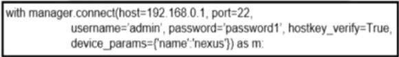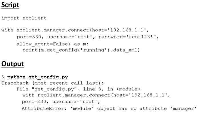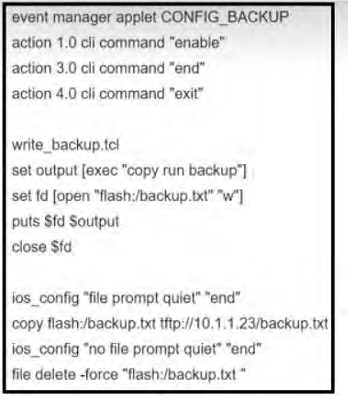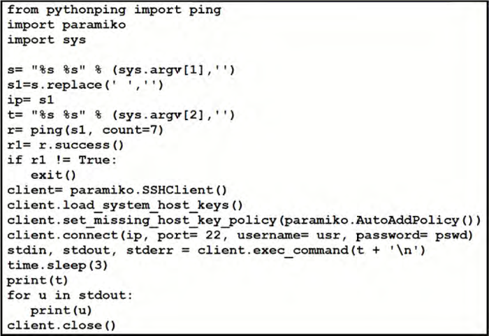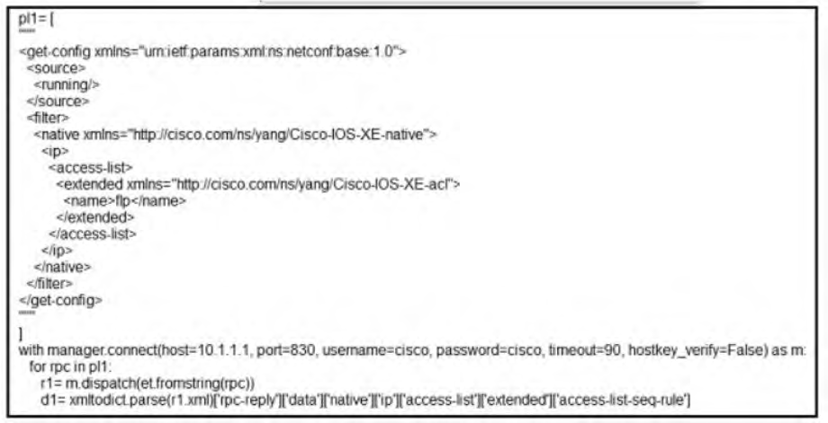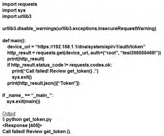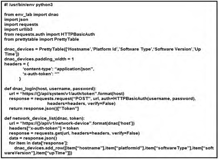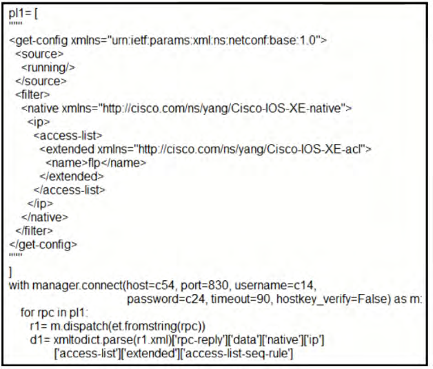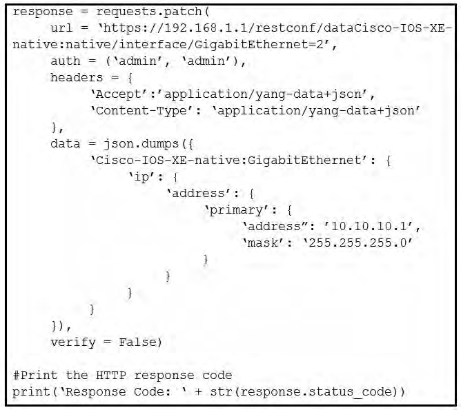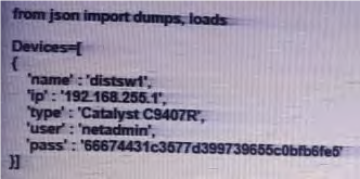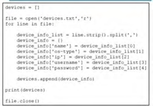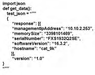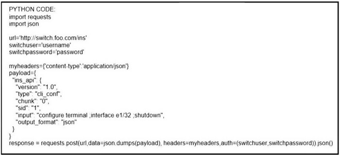 Welcome to your ENCOR-AUTOMATION 1. Which two HTTP functions correspond to the UPDATE function in CRUD? (Choose two.) A. PUT B. DELETE C. PATCH D. GET E. POST 2. What are two syntax rules for writing a JSON array? (Choose two.) A. A semicolon separates the key and list of values. B. A space must separate each value in the array. C. The array can include only one value D. Values are enclosed in square brackets. E. Each value in the array is separated by a comma. None 3. Which API does the Cisco DNA Center controller use for user authentication? A. Fabric Device B. Network Device C. Authentication D. Token None 4. Which statement describes the function of GitHub? A. It is an online game site. B. It is a service provider for virtualized servers and applications. C. It is a hosted web-based repository for code. D. It is an online storage service for personal files. None 5. Which type of API is used to carry configuration changes from a network controller to individual network devices in network automation applications? A. lower layer B. southbound C. eastbound D. northbound None 6. A network administrator is checking and making configuration changes on a network device from home. What are two ways to secure the connection between the command-line interface (CLI) of the network device and the remote workstation used by the administrator? (Choose two.) A. through a Telnet connection B. through an SSH connection C. through a virtual terminal application D. through an HTTP interface E. through a VPN connection 7. What is the characteristic of the Postman application that relates to using APIs? It provides a GUI to interact with remote workstations. B. It is a web-based application to connect to various network devices. C. It is a web-based email client. D. It uses a console-based approach to interact with APIs. None 8. Why does the program result in an error? . The following program was created in Python. user_input = int( input(" What is 3 * 2? "))Â if (user_input = 6):Â print (" Correct!")Â else: print (" Incorrect...") A. There should be double equal signs when checking conditional equality. B. The quotation mark is not needed in the print function. C. 3 * 2 does not equal 6. D. The user_input variable was not defined. None 9. In a hosted Chef type of deployment, where is the Chef server located? A. on a LAN located near to the other chef components B. in the cloud C. on a workstation D. in the enterprise core None 10. Which term is used to describe a set of instructions for execution by the configuration management tool Puppet? A. Manifest B. Playbook C. Cookbook D. Pillar None 11. What is the SaltStack agent called that runs on nodes? A. station B. reactor C. minion D. chef None 12. . A student is studying in preparation for an interview for a job in programming and network automation. What is a characteristic of Ansible ? A. It is an agentless automation tool. B. It is a programming interface that communicates from a network controller to its management software. C. It is a hosted web-based repository that uses version control for storing and sharing code D. It is a free online tool that can check the format of programmed files to verify that they have valid syntax. None 13. Which statement describes the Cisco Embedded Event Manager? A. It is a security policy management platform that provides highly secure network access control (NAC) to users and devices. B. It is a centralized management platform that aggregates and correlates threat events. C. It is a collector and aggregator of network telemetry data that performs network security analysis and monitoring. D. It is a Cisco IOS tool that allows engineers to build task automation software applets. None 14. Which configuration management tool uses an agentless approach? A. Ansible B. Chef C. SaltStack D. Puppet None 15. In which type of deployment is the Chef server hosted in the cloud? A. private Chef B. hosted Chef C. Chef Solo D. Chef Client and Server None 16. . What is a characteristic of the Cisco Embedded Event Manager? A. It uses playbooks written in YAML to deploy configuration changes. B. It is a software component of the Cisco IOS. C. It is built on Python and has a Python programming interface. D. It is an open source tool based on the Ruby language. None 17. Which language is used to write Ansible playbooks? A. YANG B. YAML C. Python D. JSON None 18. A student is studying in preparation for an interview for a job in programming and network automation. What is a characteristic of Chef? A. It is a free online tool that can check the format of programmed files to verify that they have valid syntax. B. It is a hosted web-based repository that uses version control for storing and sharing code. C. It is an open source configuration management tool that is designed to automate configurations and operations of a network and server environment. D. It is a markup programming language. None 19. A student is studying in preparation for an interview for a job in programming and network automation. What is a characteristic of GitHub ? A. It is an application that can interact with APIs using a console-based approach and allows various data types and formats to interact with REST-based APIs. B. It is a hosted web-based repository that uses version control for storing and sharing code. C. It is an acronym that describes functions that most applications or databases use to store or alter data. D. It is a data format that stores all of its information in key/value pairs and surrounds each object with curly braces. None 20. A student is studying in preparation for an interview for a job in programming and network automation. What is a characteristic of CRUD ? A. It is a data model that describes what can be configured, monitored, executed, and reset on a device. B. It is a markup programming language. C. It is a free online tool that can check the format of programmed files to verify that they have valid syntax. D. It is an acronym that desc